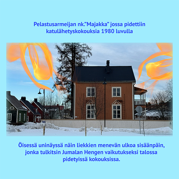 Nuorempana uskovana lähdin mukaan paikallisiin lauantaisin järjestettäviin katulähetys kokouksiin, olihan niissä kävijöinä monia tuttuja ennen uskoontuloa. Kerran unessa katsoin siihen aikaan käytössä olleen kokousrakennuksen tulipaloa. Oli merkillinen asia kun liekit löivät sisäänpäin ikkunoista ei ulospäin kuin normaalissa tulipalossa. Kerroin tämän silloiselle sen järjestön johtajalle jolla oli kyseinen kiinteistö hallinnassaan. Sanoin että joko luonnollinen tai hengen tuli oli kysymyksessä. Hän totesi että pitäisi ainakin tarkistaa palovakuutukset johon minäkin olin kertomuksessani kehoittanut. Talo on kyllä yhä paikallaan tietojeni mukaan tätä kirjoittaessani.Ajattelin sen sittenkin olleen Hengen tulta, kun kokemukset saivat jatkoa…