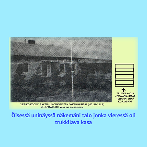 Katselin öisessä uninäyssä matalaa taloa jonka vieressä oli kasa trukkilavoja. Niihin aikoihin olin kuullut paikasta nimeltä Jerikokoti ja myös sen missä se sijaitsi.En koskaan ollut käynyt siellä ,mutta alkoi tulla halu lähteä katsomaan millainen paikka se oikein on? Aloin puhua asiasta muille uskonyhteisön ystäville. Paikalla oli eräs vanhempi sisar joka kertoi seudun olevan hänelle tuttua ja että hän voisi alkaa järjestää sinne vierailumahdollisuutta.