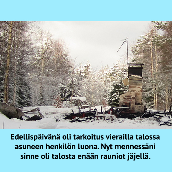 Tullessani tuttavan omakotitalon pihaan, siellä ei enään taloa ollut, oli vain mustunut savupiippu jossa mutkalle mennyt tv. antenni törrötti. Se oli melkoinen herätys saarna minulle. Missä on asukas? Juuri eilen aamulla oli sisäinen kehoitus mennä häntä tapaamaan. Aloin hankkimaan tietoa , ja sain kuulla että oli viety savumyrkytyksen uhrina sairaalaan toiselle paikkakunnalle. Lähdin sinne. Tavattuamme kerroin suoraan mitä oli kokenut edellis päivän aamuna.Se että vielä tapasimme, ei ollut itsestään selvää. Ehkä hänkin sai vielä jatkoaikaa ajatella ja pitää Jumala suhdettaan kunnossa?