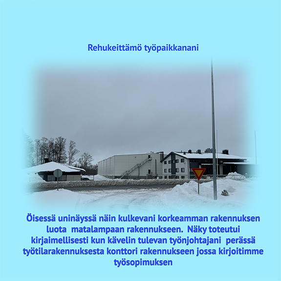 Niinä aikoina olin myös rukoillut Herraa osoittamaan uutta työpaikkaa. Hän vastasi: Näin uninäyssä kuinka kävelin jonkun pihan poikki johonkin matalaan rakennukseen.Silloin en vielä käsittänyt mistä on kysymys? Lehdessä oli työpaikka ilmoitus eräällä minkin ja ketun rehukeittämöllä sesonkiajaksi.Päätin lähteä paikan päälle kyselemään. Pihaan tullessani käsitin että paikka oli sama kuin näyssä, sitten menin sisälle korkeampaan rakennukseen ja kohta työnjohtajan opastuksella kävelimme siihen matalaan rakennukseen joka oli heidän konttoritilansa tekemään työsopimuksen. Sitten alkoikin Herran edessä kysely miksi tänne töihin?